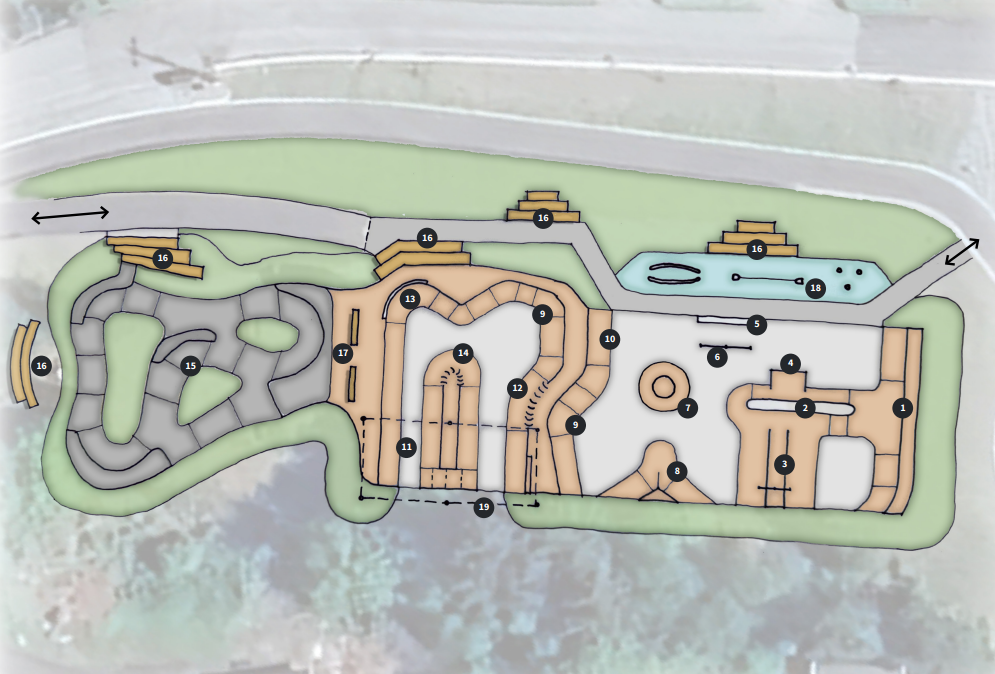 Skatepark delen inneholder mange forskjellige elementer, hvor de fleste kan brukes på skateboard, sykkel, eller sparkesykkel. Her er det lagt inn quarterpipe (1), central quarterpipe island (2), driveway med rainbow rail (3), manny pad (4), ledge (5), flat bar rail (6), volcano (7), flat bank hip med blended pump bump (8), quarterpipe med bowl corner (9), flat bank (10), mini ramp med roll over bumps (11), jump ramp (12), extension bowl corner (13), og central island med rolled edge (14).